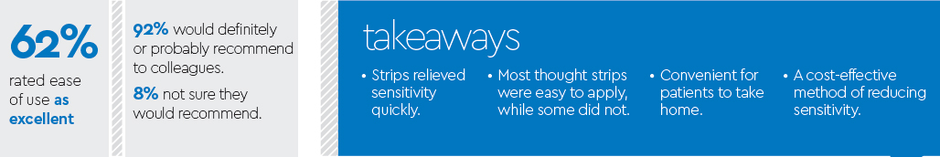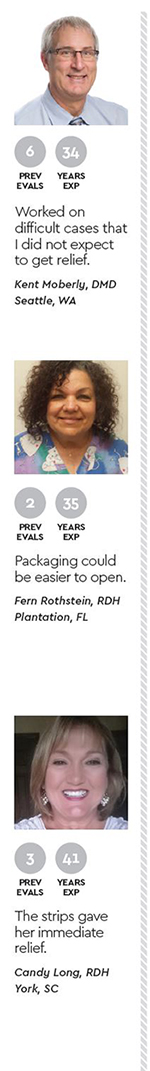 Another DPS evaluator, Harriet Ludjin, RDH, said she is always looking for ways to relieve patients’ sensitivity, and this product brings relief quickly. Ludjin described the strips as another effective treatment modality that are readily available for the consumer and uncomplicated to use. “It gives patients hope that they wouldn’t have sensitivity all their lives.”