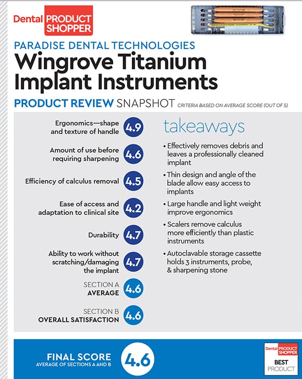 After 4 years, Moncourtois concluded, “The Wingrove titanium implant set is holding up well. They are by far the best implant instruments I have used in my 25 years of being a hygienist.” Curran said her day is more efficient and productive when she uses the Wingrove instruments, and Sander shared, “I am grateful for these scalers and pleased our office has incorporated them into our daily routine.”